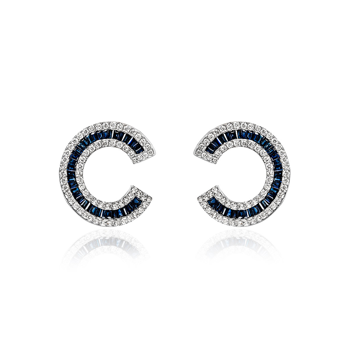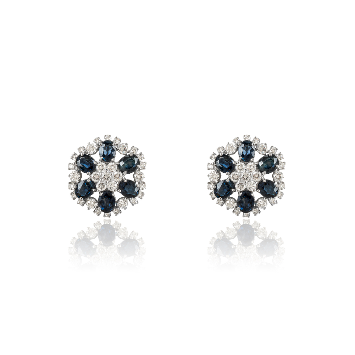 A beautiful pair of 18k white gold sapphire and diamond earrings. The floral earrings comprise of 62 diamonds and 12 sapphires alternating from the centre out. The round brilliant cut diamonds have a total weight of 1.38ct, G-H colour and VS clarity. The oval cut sapphires have a total weight of 4.88ct and display a deep blue hue throughout. The 18mm wide earrings feature post and butterfly fittings and have a gross weight of 8.90 grams.