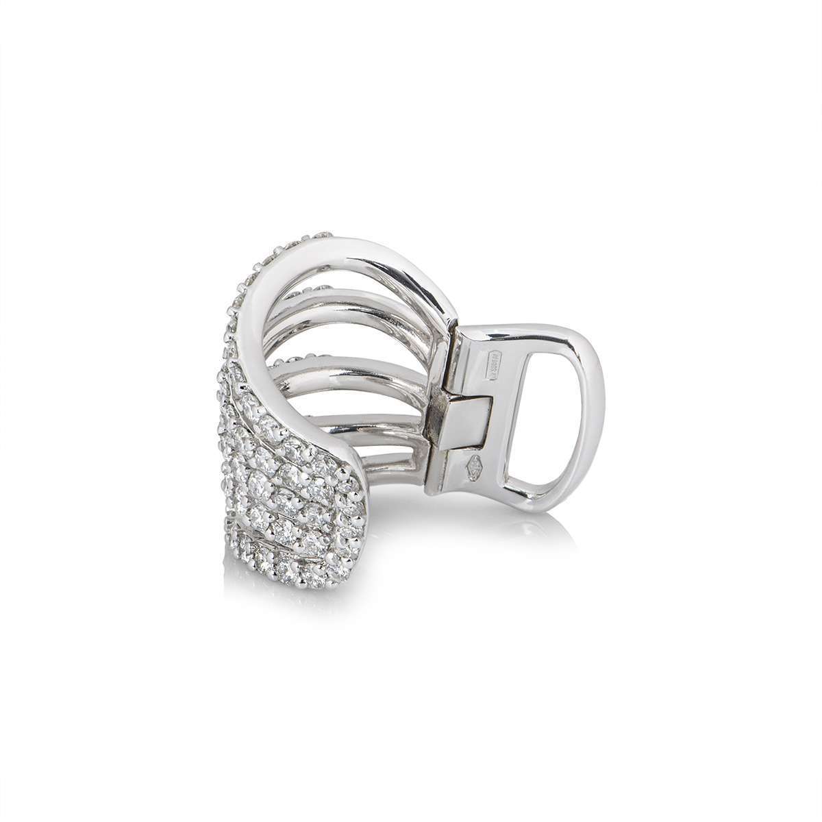 A stylish 18k white gold diamond ear cuff. The ear cuff is set with 67 round brilliant cut diamonds with a total weight of 1.30ct. The ear cuff is designed to wrap around the Helix, secured by a sprung clip. The ear cuff measures 1.8cm in length and has a gross weight of 6.4 grams.