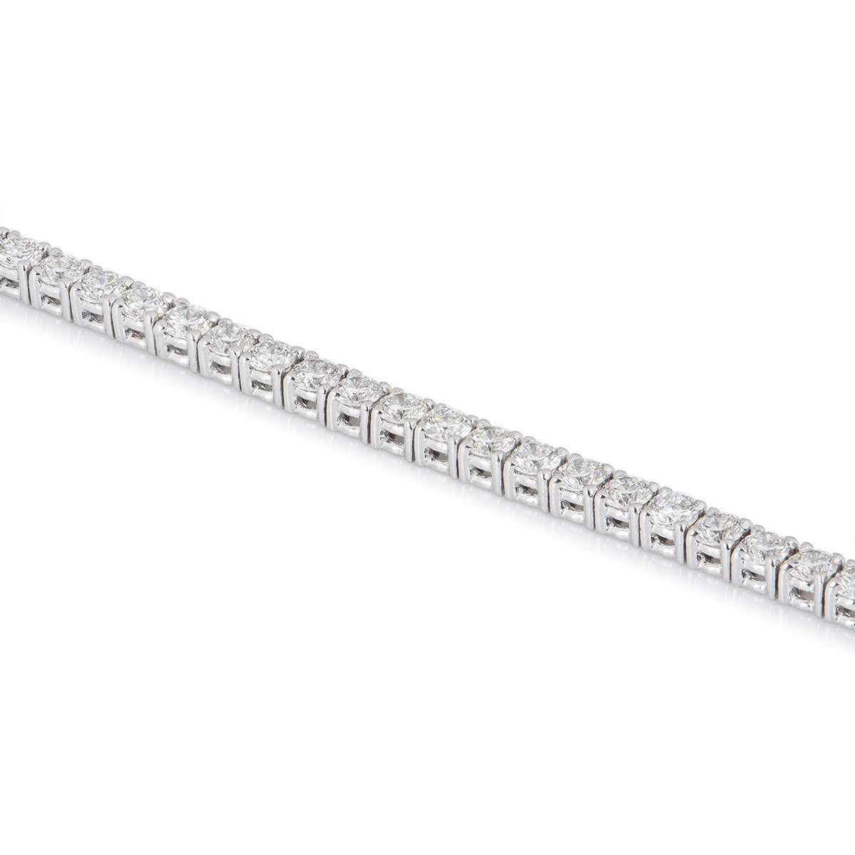 An 18k white gold diamond line bracelet. The bracelet is set with a total of 3.50ct of round brilliant cut diamonds in a claw setting. The bracelet measures 7 inches in length and features a tongue clasp, with a figure of eight clasp on the side for added security. The bracelet has a gross weight of 8.1grams.