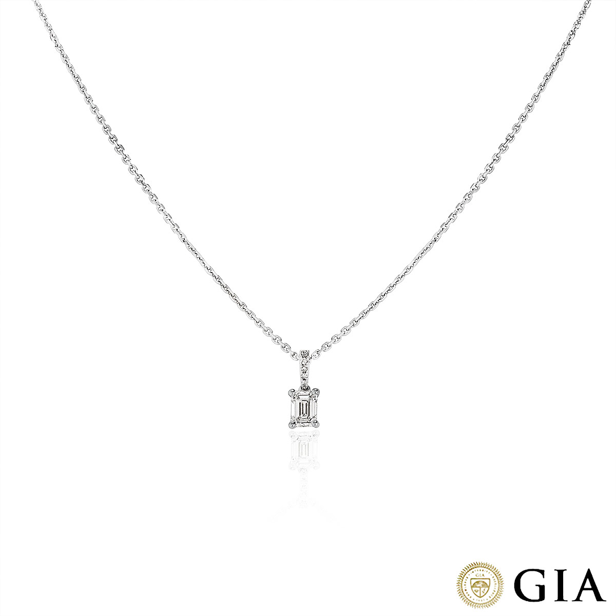 An elegant 18k white gold diamond pendant. The pendant features an emerald cut diamond weighing 0.92ct, G colour and SI1 clarity freely moving below a diamond set bail. The bail is pave set with 5 round brilliant cut diamonds with an approximate total weight of 0.04ct, well matched in colour and clarity. The pendant suspends from an 18-inch chain, finishes with a lobster clasp and has a gross weight of 2.98 grams.