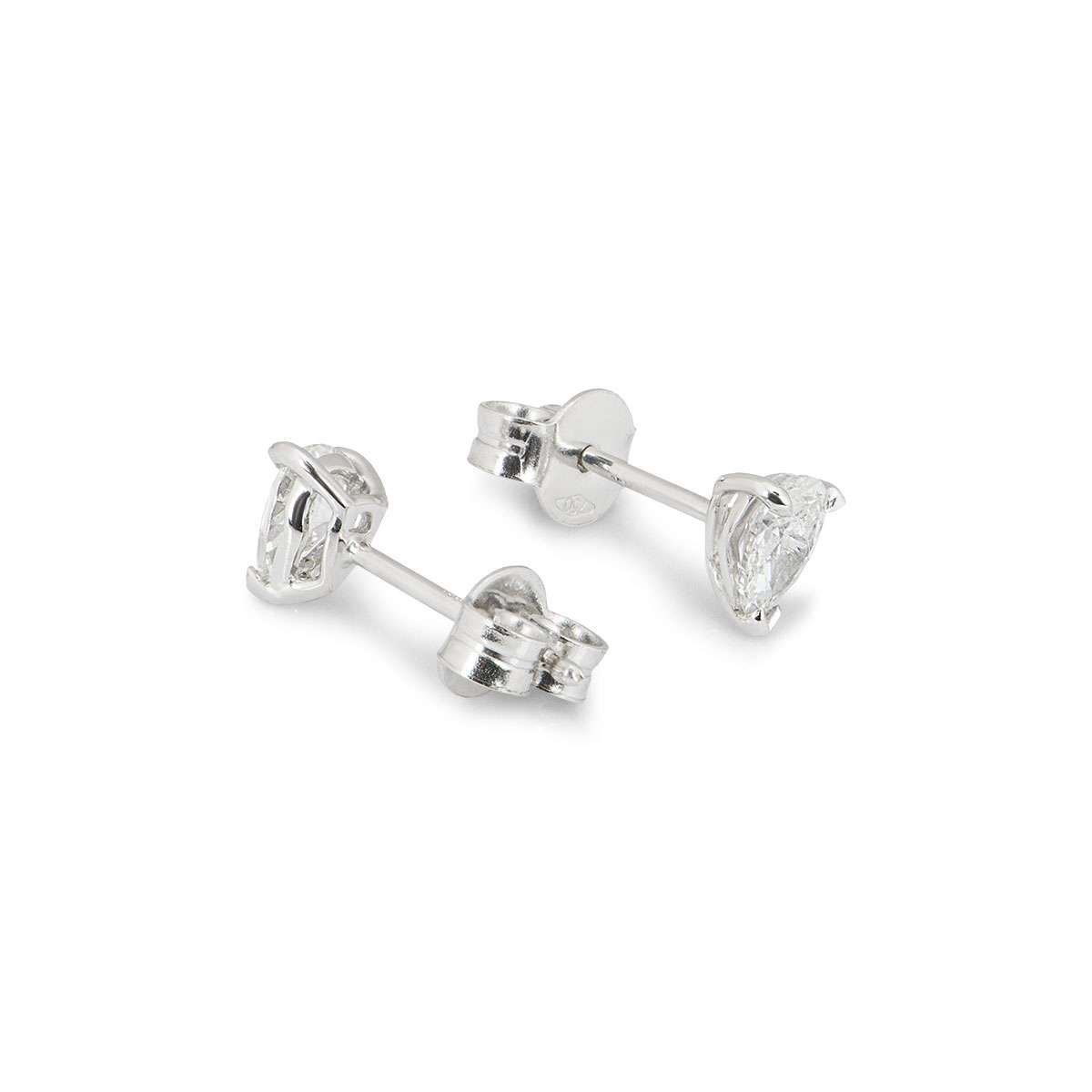 A pair of 18k white gold diamond stud earrings. Each earring is claw set with a single pear cut diamond weighing approximately 0.40ct each. The earrings feature post and butterfly fittings and have a gross weight of 1.1 grams.