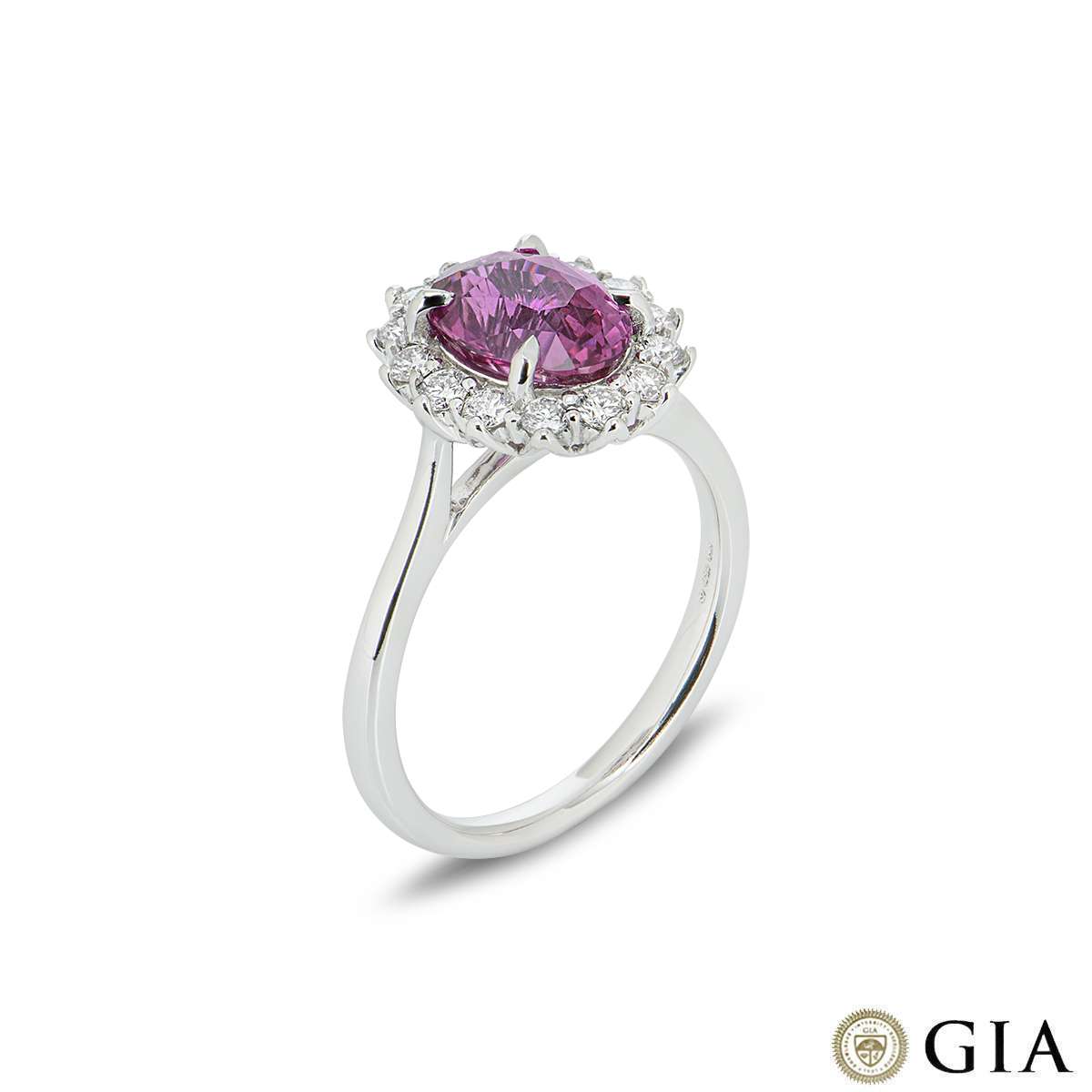 A stunning pink sapphire and diamond ring in 18k white gold. The oval cut pink sapphire weighs 2.58ct and displays a bright even pink colour, with no indications of heating. Surrounding the sapphire are 14 round brilliant cut diamonds totalling 0.48ct. The ring is currently a size M½ but can be adjusted for a perfect fit and has a gross weight of 4.3 grams.