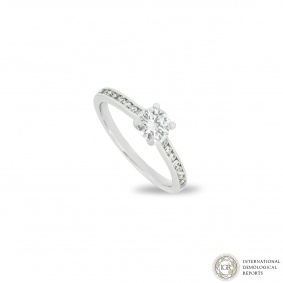 A unique 18k white gold diamond engagement ring. The ring features a round brilliant cut diamond set to the centre in a four claw mount weighing 0.50ct, F colour and SI1 clarity. The diamond is further complemented by diamond shoulders in a twist design with an approximate total weight of 0.19ct. The ring has a gross weight of 3.10 grams and currently a size L½ but can be adjusted for the perfect fit.