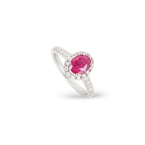 A classic 18k white gold ruby and diamond three stone ring. The ring features an oval cut ruby weighing 0.99ct set in a four claw mount. Further complementing the ruby are two pear cut diamonds set to either side with an approximate total weight of 0.40ct, G colour and VS clarity. The ring has a gross weight of 3.25 grams and is currently a size J but can be adjusted for the perfect fit.