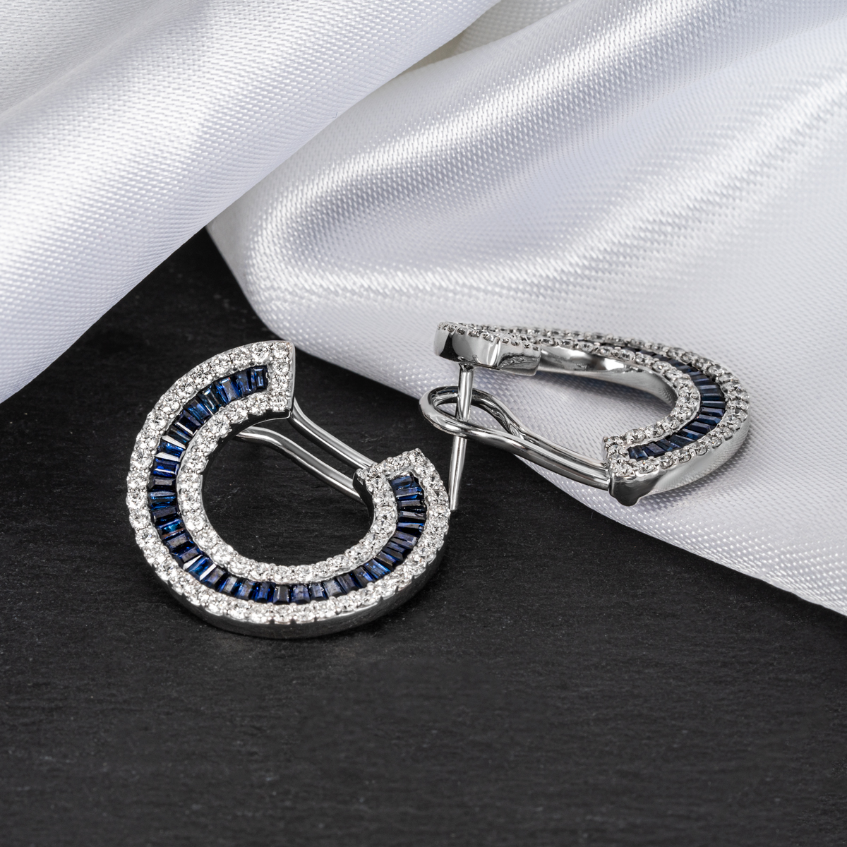 A beautiful pair of 18k white gold sapphire and diamond earrings. The earrings each comprise of a spiral motif with 35 baguette cut sapphires set through the centre with a halo of 65 round brilliant cut diamonds. The sapphires have a total weight of 2.28ct, with a deep blue hue throughout and the diamonds have a weight of 1.40ct, G-H colour and VS-VVS clarity. The earrings finish with post and lever-hinged fittings and have a gross weight of 9.79 grams.