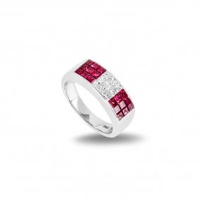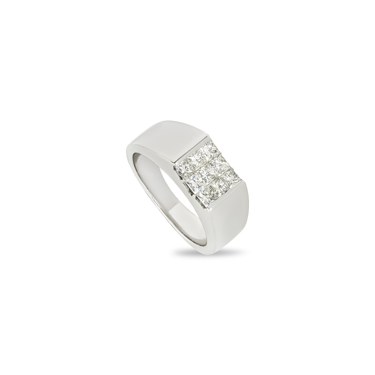 A sapphire and diamond dress ring set in 18k white gold. The ring is composed of 18 princess cut sapphires totalling 2.00ct and 9 princess cut diamonds totalling 0.50ct. The diamonds are G-H colour, VS clarity and the sapphires have an even rich blue tone. The ring is 7mm in width, has a gross weight of 7.52 grams and it is currently a size N, but can be adjusted for a perfect fit.