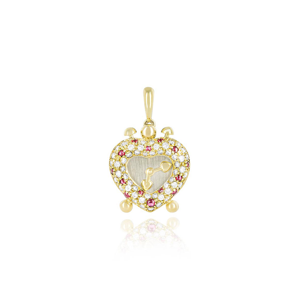 An 18k yellow gold sapphire and diamond heart clock pendant. The pendant comprises of a heart clock motif which has 50 round brilliant cut diamonds and 14 cabochon cut sapphires in a pave setting alternating around the outer edge with a silver dial and yellow gold clock hands. The 50 round brilliant cut diamonds have an approximate weight of 0.47ct, G-H colour and VS-SI clarity. The 14 sapphires have an approximate weight of 0.42ct and display a deep blue hue. The pendant measures 2.70cm in length and 1.80cm in width, finishes with a loop bail and has a gross weight of 6.97 grams