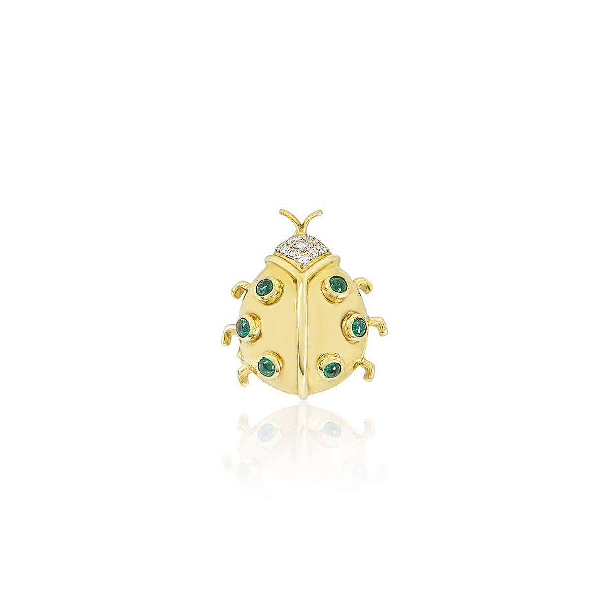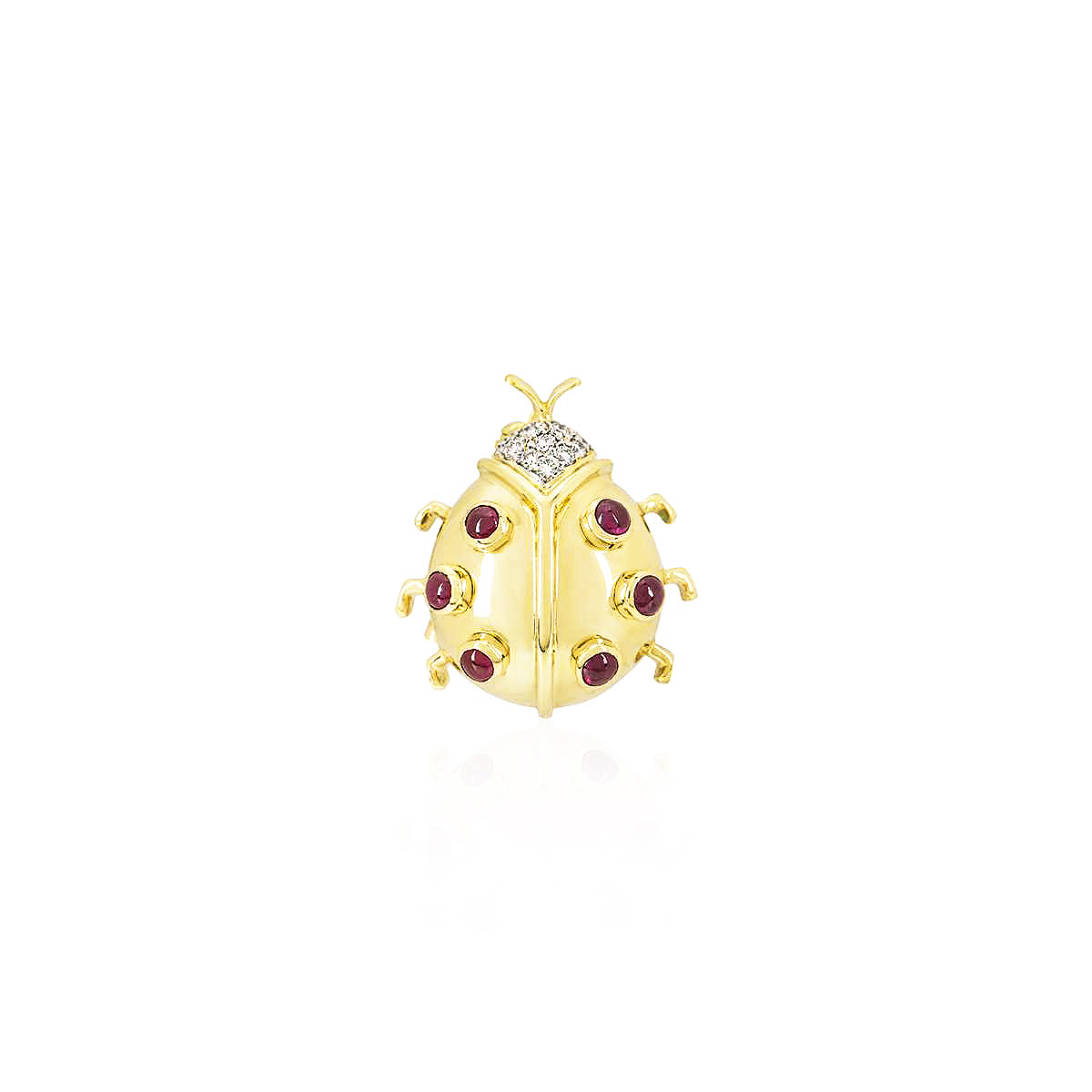 An 18k yellow gold Ladybird brooch. The brooch is set with 4 cabochon sapphires throughout the wings, with a row of 9 square cut rubies running through the centre of the body and 28 round brilliant cut diamonds set in the wings and head. The rubies total approximately 0.40ct, the sapphires total approximately 0.22ct and the diamonds total approximately 0.56ct. The butterfly measures 2cm in width and 2.5cm in length, complete with a pin clasp at the back. The brooch has a gross weight of 9.8 grams.