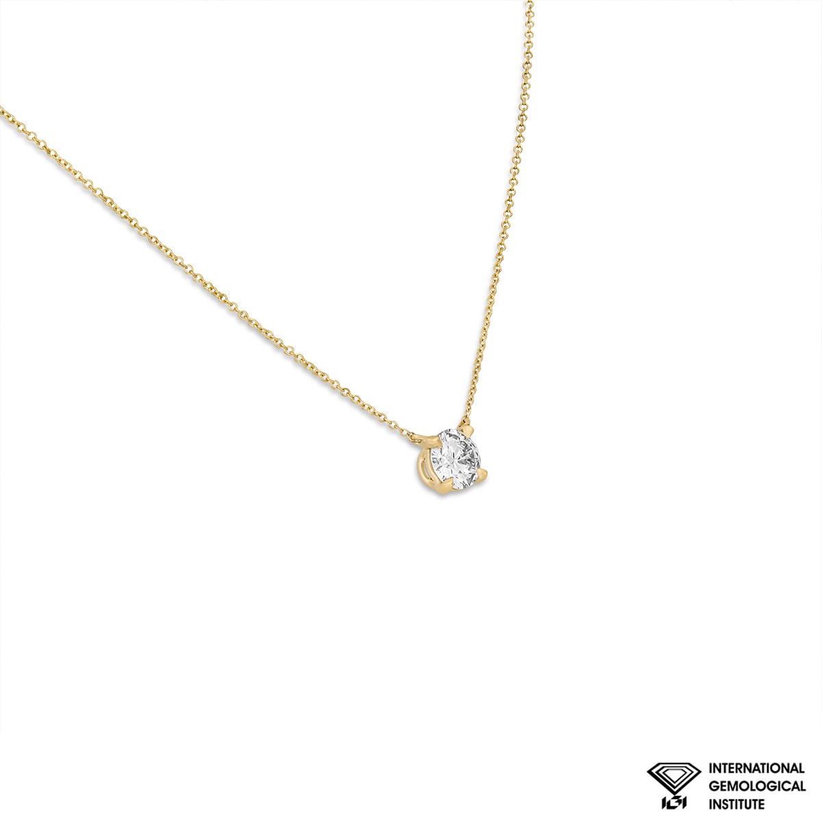 A stunning 18k yellow gold lab grown diamond pendant. The pendant is adorned with a round brilliant cut lab grown diamond in a modern four prong setting weighing 1.14ct, G colour and VS1 clarity. The diamond scores an excellent rating in all three aspects for cut, polish and symmetry - this is known as a 'triple excellent' diamond. The lab grown diamond is centred on a fine 16-inch chain that finishes with a lobster clasp and has a gross weight of 2.33 grams.