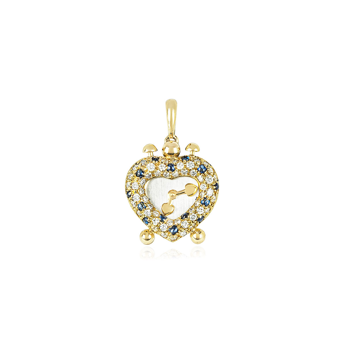 An 18k yellow gold ruby and diamond heart clock pendant. The pendant comprises of a heart clock motif which has 50 round brilliant cut diamonds and 14 cabochon cut rubies in a pave setting alternating around the outer edge with a silver dial and yellow gold clock hands. The 50 round brilliant cut diamonds have an approximate weight of 0.44ct, G-H colour and VS-SI clarity. The 14 rubies have an approximate weight of 0.38ct and display a rich red hue. The pendant measures 2.70cm in length and 1.80cm in width, finishes with a loop bail and has a gross weight of 7.00 grams