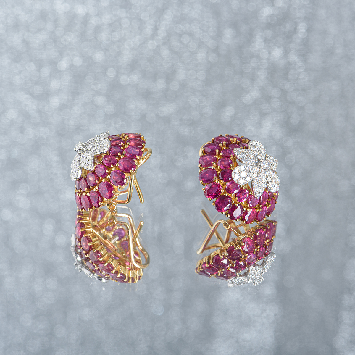 A beautiful pair of yellow & white gold diamond and ruby earrings. The earrings comprise of a pave set diamond flower motif set to the centre and two rows of oval cut ruby halos. The round brilliant cut diamonds have an estimated total weight of 1.70ct, F-G colour and VS+ clarity. The oval cut rubies are clarity enhanced and have an estimated total weight of 9.16ct. The earrings measure 20mm wide, finish with post and omega backs and have a gross weight of 22.01 grams.